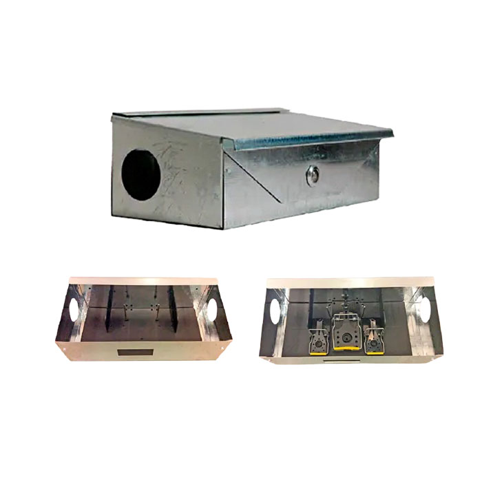 Trinol rottestasjon i metall med to spyd til festing av giftposer eller blokker. Rottekassen er låsbar, og nøkkel medfølger.