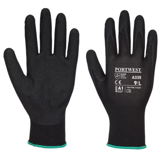 Portwest Gloves A335 svart(K8) Dermi-grip NPR15 Nitril Granular . Den perfekte blandingen av komfort og pris. Slitesterk 15 gauge Pylon-foring kombinert med et granulært nitrilbelegg for utmerket grep og fingerferdighet under alle forhold. Lett. detaljkort. Palm dyppet. Nitril granulært belegg. Strikkfasthet 15. Generell bruk. Dermi-Grip NPR15 Nitrile Sandy.