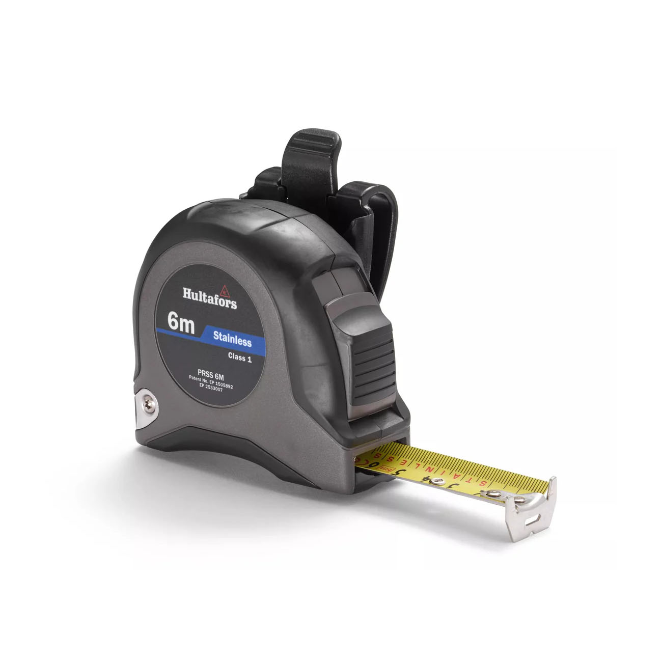 Et polyesterbelagt målebånd hvor både målebåndet og returfjæren er av rustfritt stål. Laget for arbeid i fuktige miljøer. Båndet er gradert med svært nøyaktig blekkstråleteknologi for å gi deg optimal kontrast og presisjon under måling. Huset er laget av slagfast ABS-plast som er gummibelagt for bedre grep og slagfasthet. Det har et ergonomisk grep og gummibelagt bremseknapp. Myk fjærbelastet båndretur beskytter endehaken mot skader og slitasje. 6-metersmodellen har en avtakbar belteholder med hurtigutløserfunksjon som gjør det enkelt å utløse båndet med én hånd. Endehaken justerer seg selv ved innvendig måling.