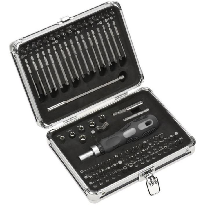 KWB Power Box - 92 deler bitssett med skralle i solid metallkoffert. Settet inneholder blant annet skrallehåndtak, bitsholder med magnet, lang bitsholder og ulike bits - inkludert spesialprofiler til bruk med elektriske apparater og komponenter.