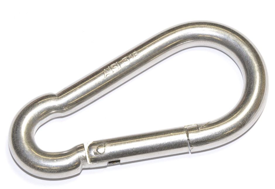 Syrefast, smidd brannmannskrok i AISI 316 stål med rustfri fjær. Sjøvannsbestandig. Minimum bruddlast 1390 kg.