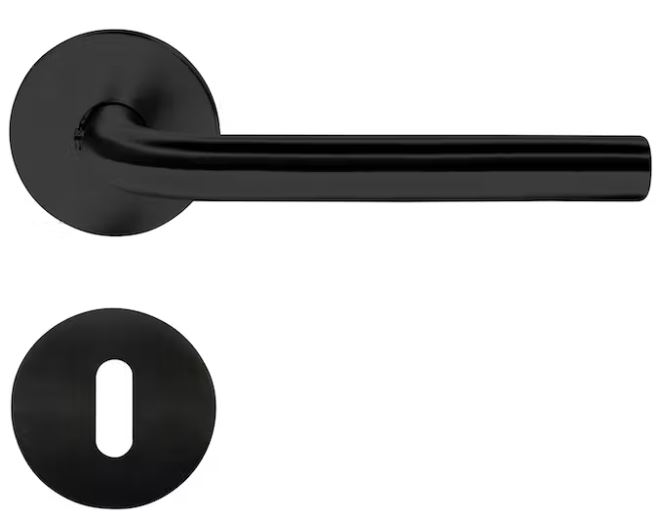 Home-It dørvrider med L-grep i rustfritt stål, pulverlakkert i matt sort. Stilrent og funksjonelt dørhåndtak med et komfortabelt grep som gjør det enkelt å åpne og lukke døren. Med klikk-rosett og tykkelse på kun 4 mm for elegant design. Komplett sett med skruer og nøkkelskilt.