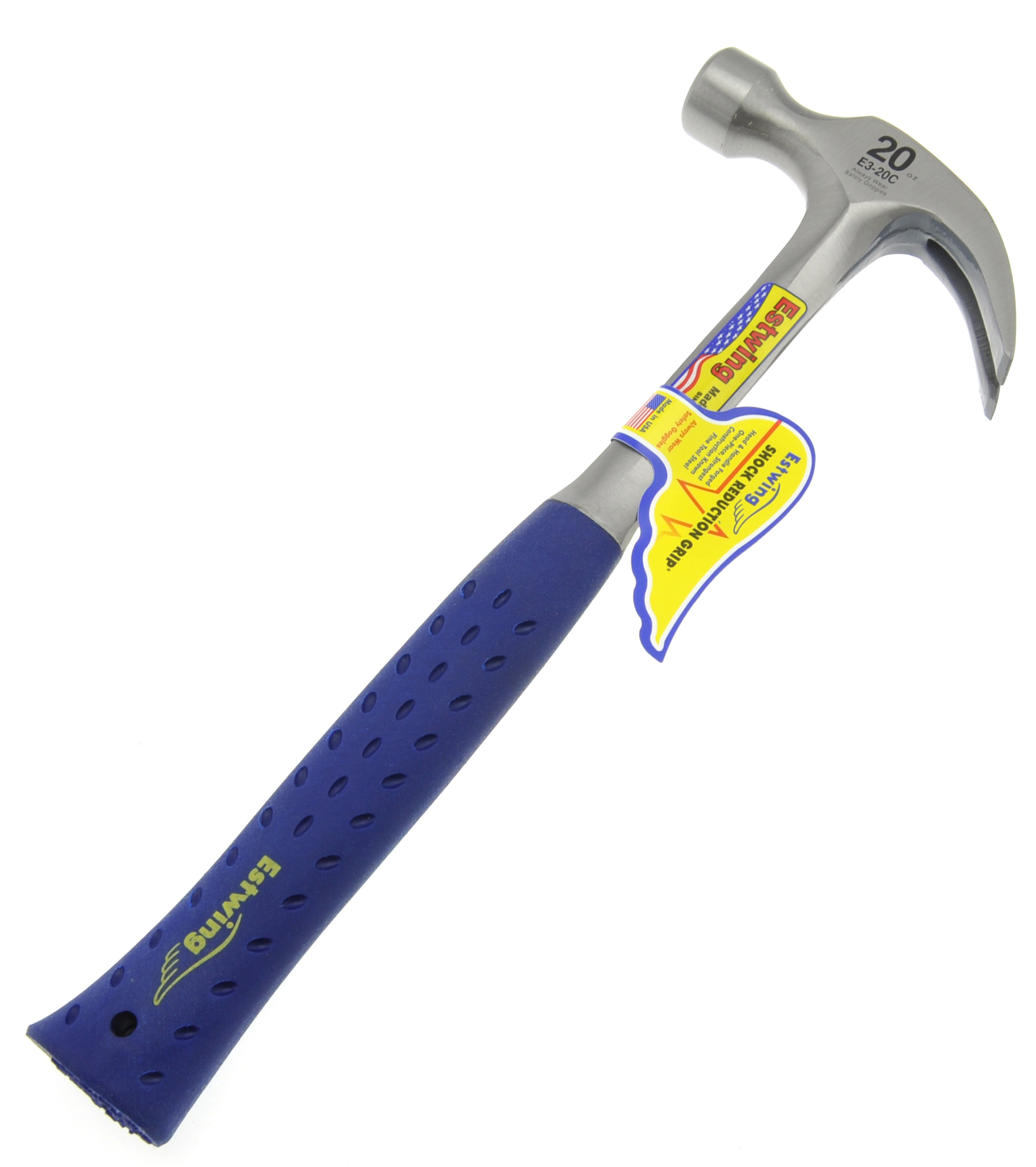 Estwing 20 oz hammer med bøyd klo. E3-20C Estwings Curved Claw Solid Steel Hammer gir uovertruffen balanse og temperament. Hodet og håndtaket er helpolert og smidd i ett stykke. Vår eksklusive Shock Reduction Grip® er støpt på og tilbyr det ypperste innen både komfort og holdbarhet, samtidig som det reduserer vibrasjoner forårsaket av støt.