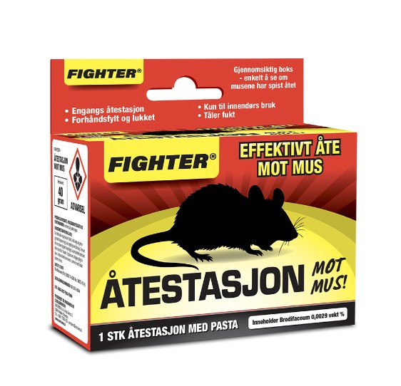Fighter Åtestasjon mot mus er en ferdigfylt engangs åtestasjon med giftpasta av giften Brodifacoum. Giften er mye brukt av profesjonelle skadedyrbekjempere og anses som den mest effektive. Giftpastaen inneholder en sammensetning av hvetemel, hakket korn, ulike fettstoffer og oljer samt smaksforsterkere og aromaer. Sammen gjør dette Fighter Åtestasjon mot mus til vår beste åtestasjon noensinne!