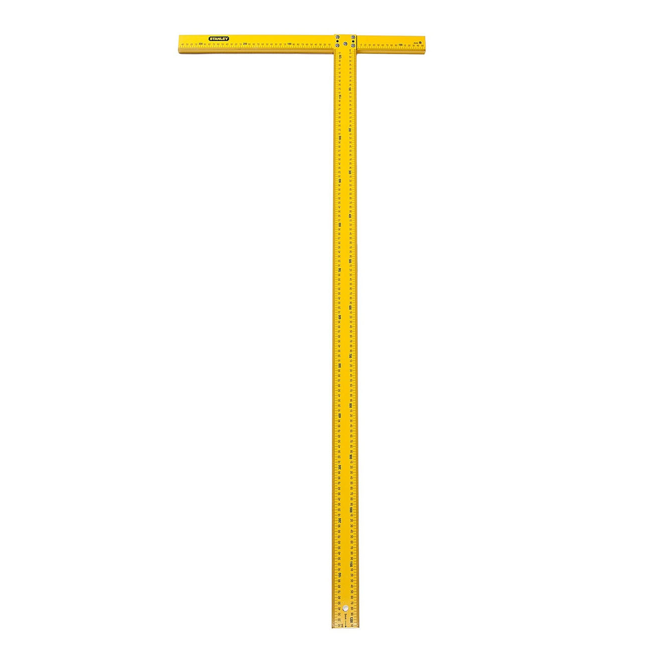 Stanley metrisk T-vinkel for gipsplate. Lettavleste svarte markeringer. Hode med spor for kutting av en 4"-plate i én omgang. 2"-blad for å kutte langs begge sidene av en koblingsboks uten å flytte verktøyet. Sliteterke bladfjærer som forblir rette uansett hvor du bøyer.