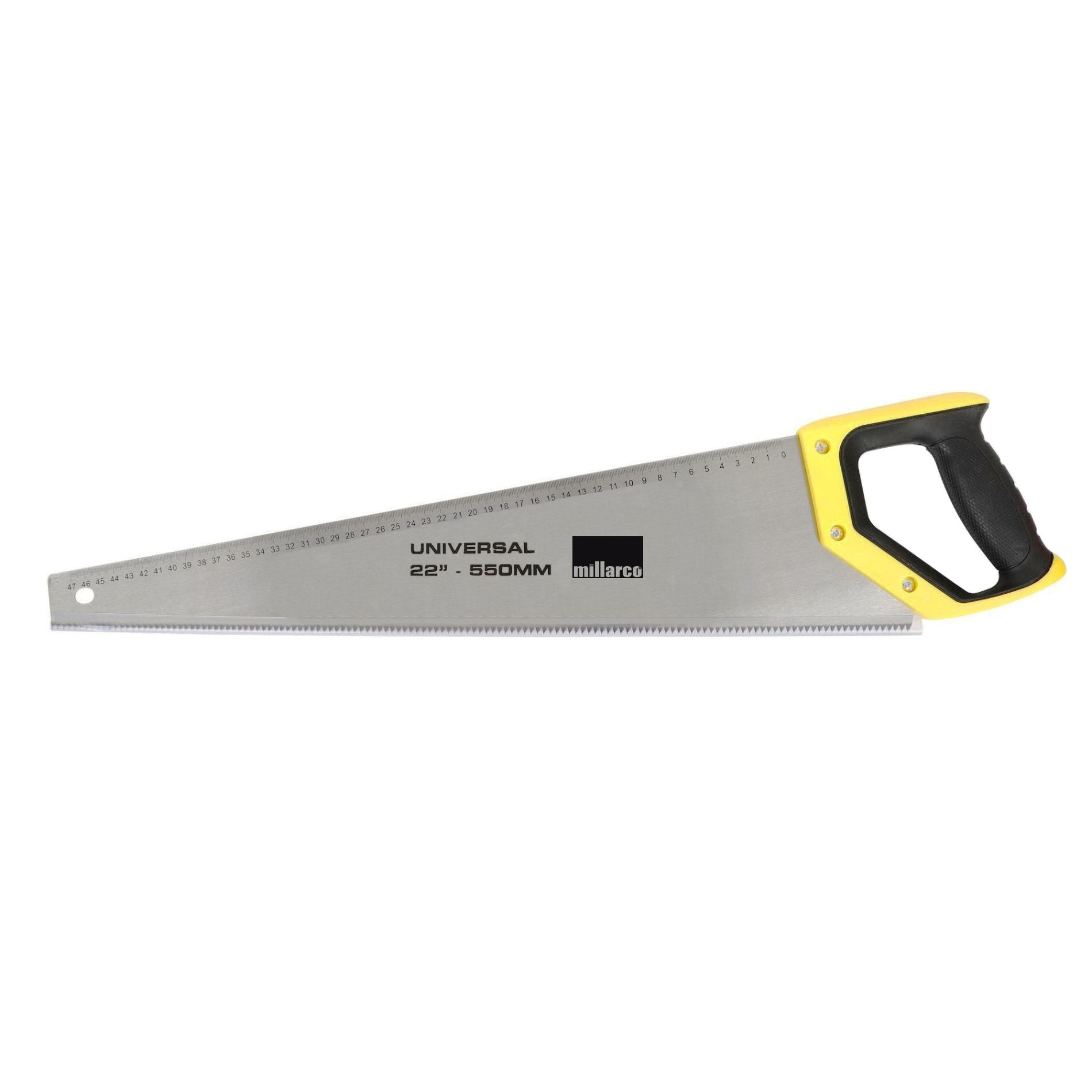 Millarco håndsag i herdet stål med måleskala og 2-komponents håndtak. Det ergonomiske håndtaket sikrer et godt grep og redusert belastning. Krysstanningen gir rene og presise kutt i skyveretningen (push håndsag), og sager effektivt gjennom tre, plast og andre materialer.Tenner per tomme: 7-9 stk.Lengde: 550 mm / 22"