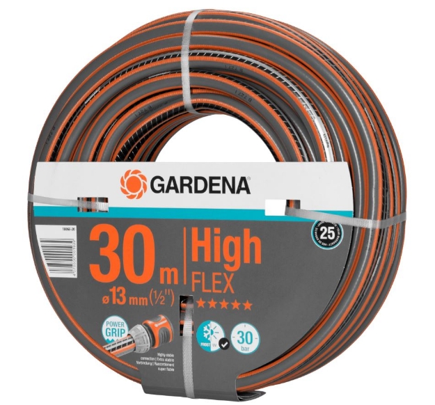 Gardena Comfort HighFlex 30m 1/2" er en trykkbestandig slange med spiralnetting og tykke vegger for sikkerhet og lang brukstid. Slangen holder godt på formen samtidig som den er fleksibel i bruk. Power Grip-profil sørger for sikker tilkobling mellom slangen og slangekoblingen.