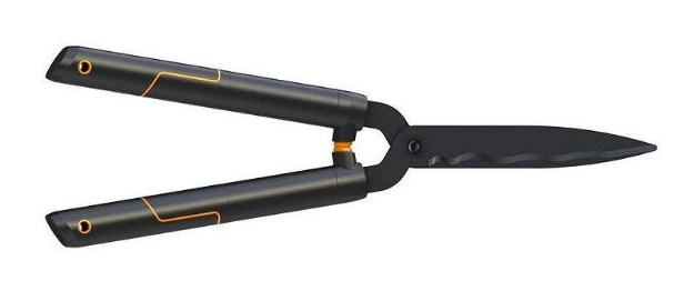 Fiskars SingleStep Hekksaks med PFTE belagt bølgeblad for effektiv klipping.