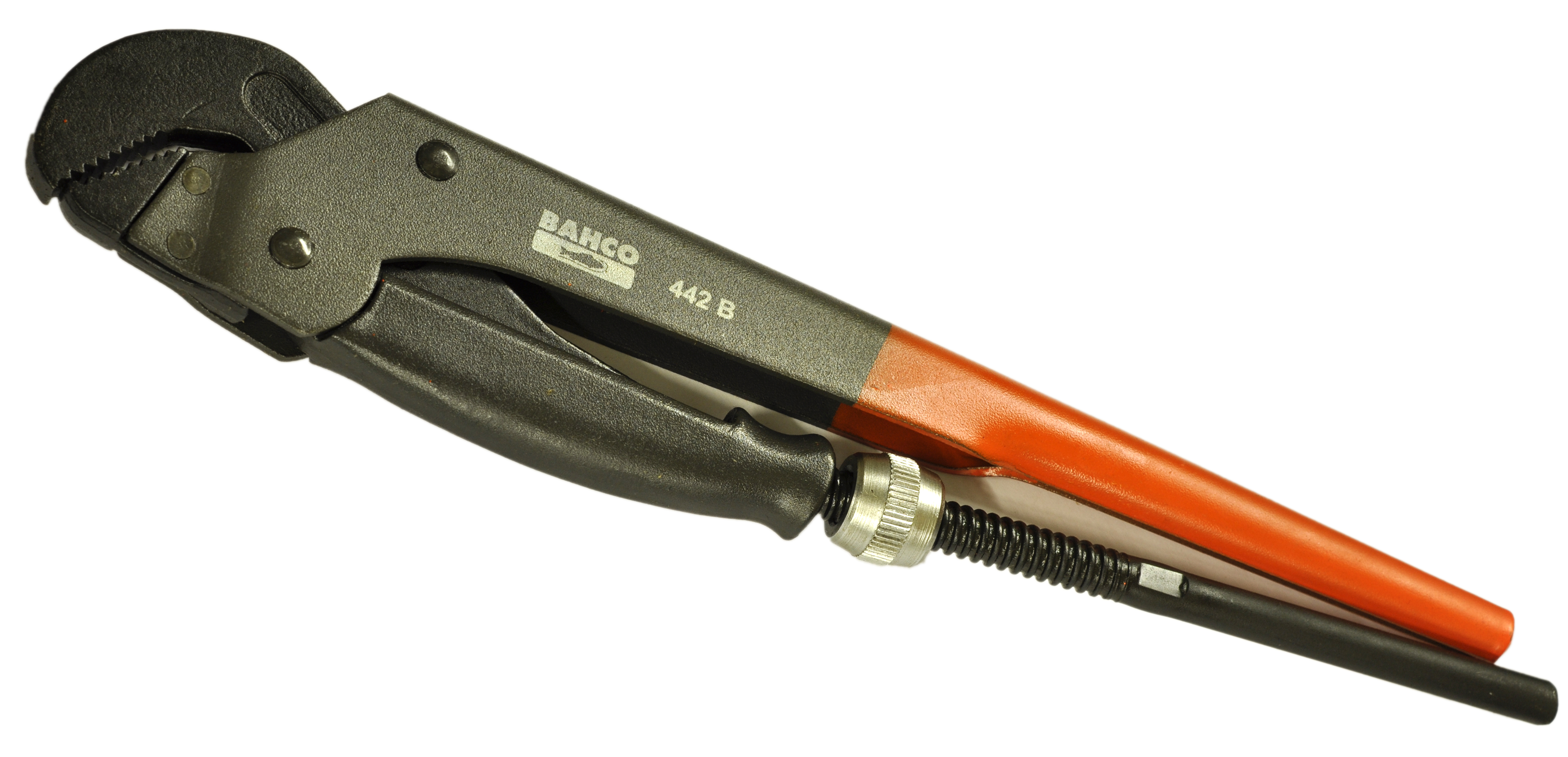 Hjørnerørtang, 442 B-444 B Hjørnerørtang. DIN 5234. Utførelse Svartoksidert, rustbeskyttet. Overarmen er fremstilt av stålplate og avrundet i grepsvennlig fasong. Underarm av seigherdet stål og forsynt med stopp for innstillingsmutteren. Induksjonsherdete kjefter i en vinkel på 45 grader. Kan brukes sammen med rørtanglås 142-3.