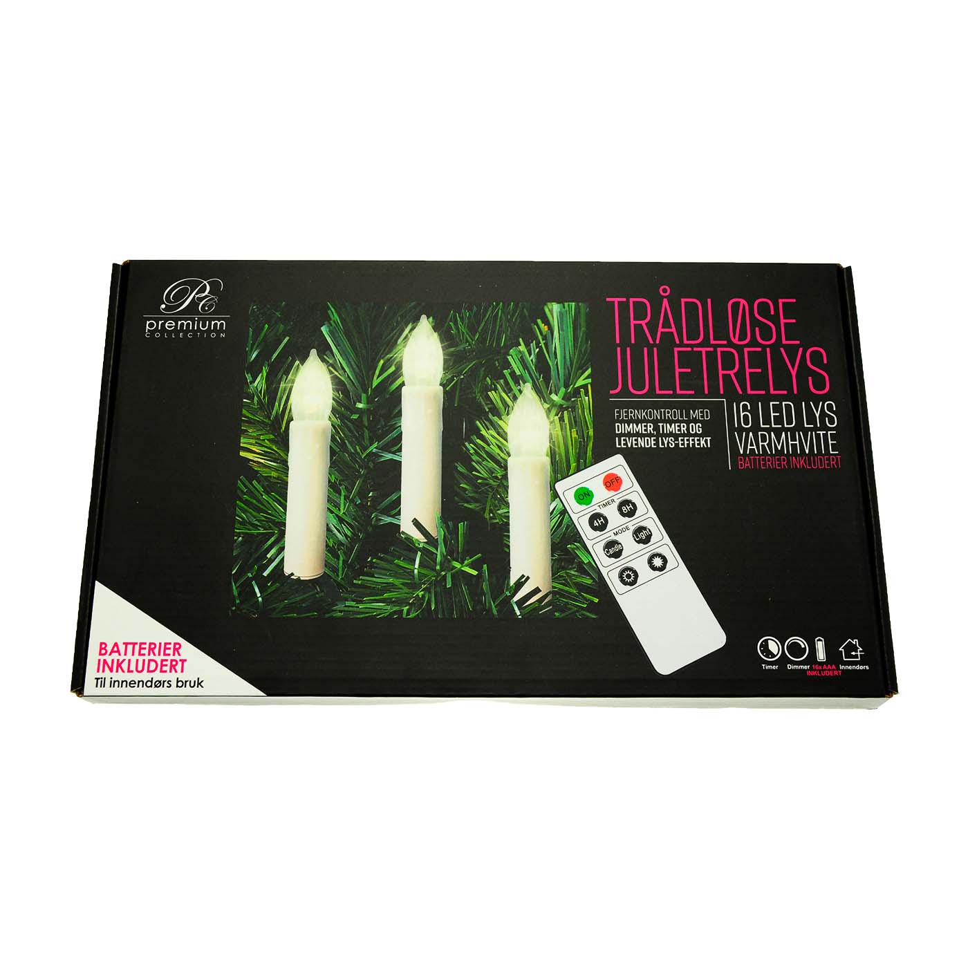 16 trådløse juletrelys med varmhvit LED-lys. Brukervennlig fjernkontroll med dimmer, timerfunksjon og ulike lysmodus. Lysene har klips som enkelt festes til juletreet.