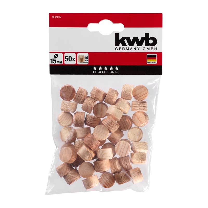 KWB kvistplugger til å skjule skader, hull og skruer i treverk.Høyde: 10 mmDiameter: 15 mmAntall i pakke: 50 stk.
