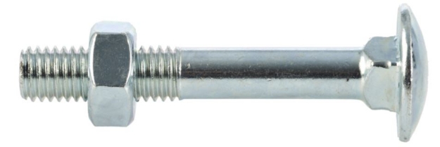 Låseskrue DIN603 med mutter DIN934 elektrolytisk forsinket. Kvalitet 4.6, delgjenget. Bruksområde: Tre mot tre og beslag i tre. Korrosjonsklasse: C1 - Kun innendørs i oppvarmede bygninger med ren atmosfære.