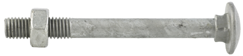 Låseskrue DIN603 med mutter DIN555 varmforsinket. Kvalitet 8.8, delgjenget. Bruksområde: Tre mot tre og beslag i tre. Korrosjonsklasse: C4 - Utendørs: Industri og kyststrøk med moderat saltinnhold. Innendørs: Kjemiske bedrifter, svømmebasseng, skipsverft, båtbyggerier.