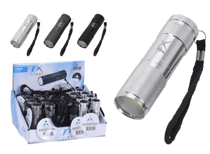 Fx liten og lyssterk lommelykt i aluminium med COB LED.Mål: 8,5 cmBatteri: 3x AAAAntall for display: 24 stk.