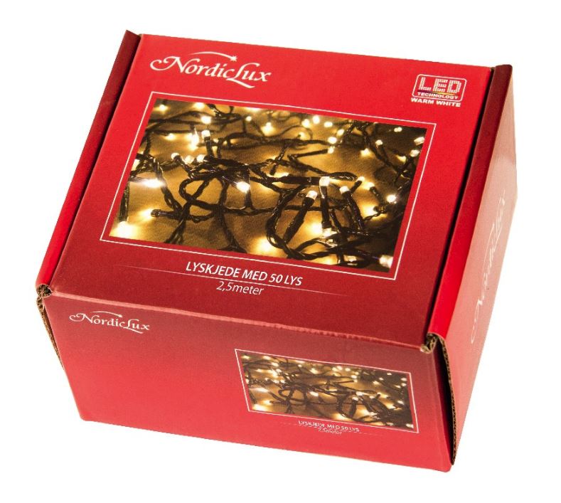 50 LED-lys.Lysslynge: 2,5 meter.Ledning: 3 meter.Farge: varmhvit.IP44 for inne- og utendørs bruk.230V ~ 50 HZ, 3.6W