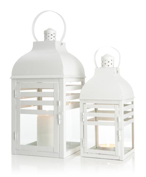 Sett med 2 lyslykter i hvit metall. Den minste lykten passer inni den store, slik at de tar mindre oppbevaringsplass.Lyktene er 32 cm og 41 cm høye.
