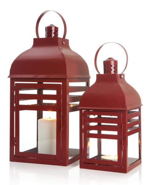 Sett med 2 lyslykter i rød metall. Den minste lykten passer inni den store, slik at de tar mindre oppbevaringsplass.Lyktene er 32 cm og 41 cm høye.