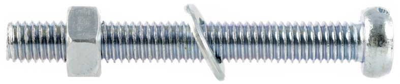 Maskinskrue, helgjenget DIN84 m/mutter og skive. Elektrolytisk forsinket og sylinderhode. Bruksområde: Sammenskruinger, tre mot tre, stål mot stål og i beslag. Miljøklasse: C1 - Innvendig i tørt miljø.