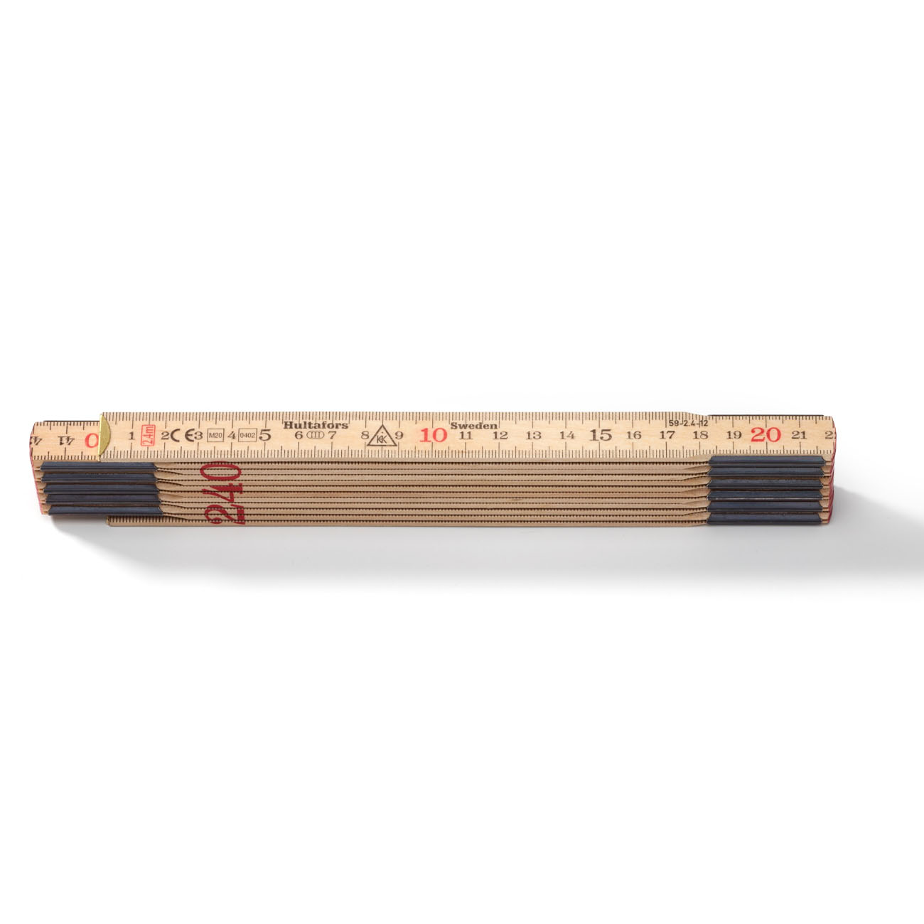 Hultafors originalen, bare lengre. Samme høye kvalitet og egenskaper, men en 2,4 m versjon tilpasset dagens byggenormer/standarder. Tradisjonelt produsert i glassbjørk med ledd i svensk stål og de karakteristiske røde endene. Denne nye modellen har arvet teknikken fra vårt lange utviklingsarbeid (siden 1883) som muliggjør høy presisjon (EU Klasse III og CE merking), tynne stikker, enkel avlesning, slitestyrke og lang levetid. Meterisk gradering i svart på begge sider med røde 10 cm merker for enkel avlesning. Hver stikke kontrolleres to ganger under produksjonen med høyhastighetskamera.