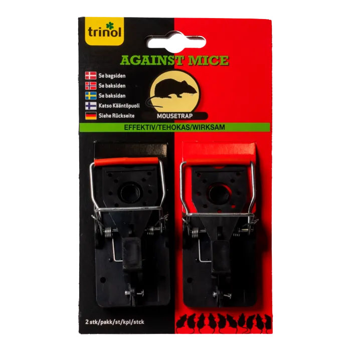 Trinol pakke med 2 tradisjonelle og kraftige musefeller med innebygd matskål. Fellen er lett å sette opp, og kan tømmes uten å komme i kontakt med fangsten, noe som sikrer god hygiene. Mus og rotter er forholdsvis sky fangstdyr, og Trinol Musefelle bør derfor plasseres langs vegger eller murer, gjerne i ly av en plate, grener eller lignende for å ha de beste mulighetene for fangst.
