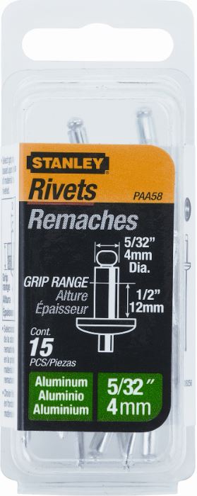 Stanley blindnagler aluminium. Passer til alle Stanley popnagletenger, for eksempel popnagletang: 0-69-804, 0-69-833, 6-MR77, 6-MR55, 6-MR100