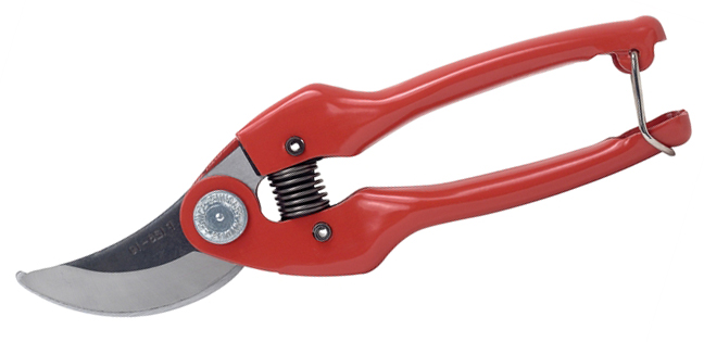 Beskjæringssaks med skarpslipte stålskjær. For beskjæring av frukttrær samt klipping av busker etc. Håndtak av kaldvalset stål. Gummiforing.