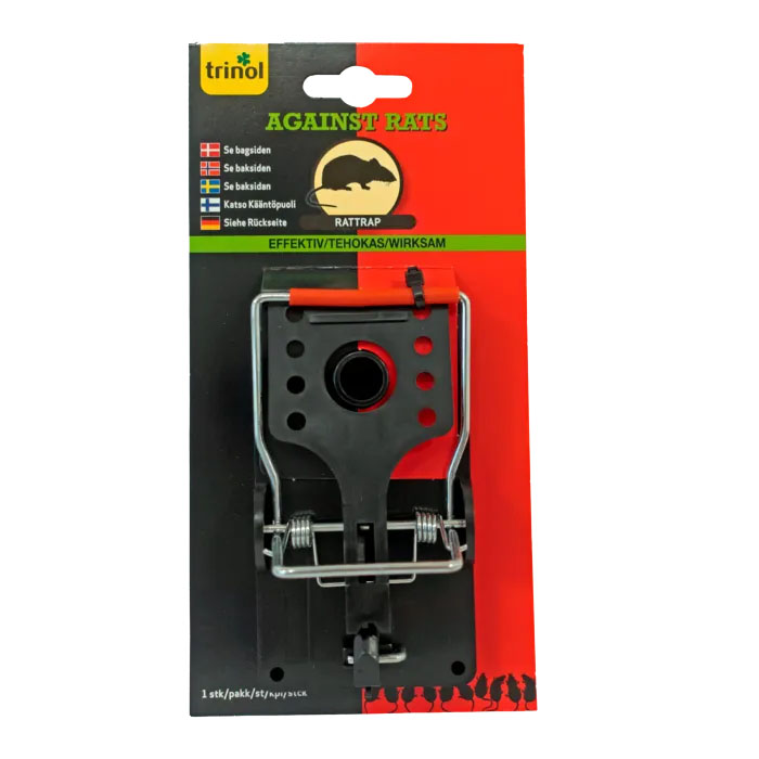 Trinol tradisjonell og kraftig rottefelle med innebygd matskål. Fellen er lett å sette opp, og kan tømmes uten å komme i kontakt med fangsten, noe som sikrer god hygiene. Mus og rotter er forholdsvis sky fangstdyr, og Trinol Rottefellen bør derfor plasseres langs vegger eller murer, gjerne i ly av en plate, grener eller lignende for å ha de beste mulighetene for fangst.