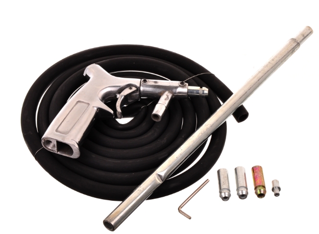 Inkl blåsepistol med 3 stk 5 mm munnstykker, oppsugingsrør og -slange (for bruk med sandsekk). 1/4" NPT kobling. 6 bar arbeidstrykk.