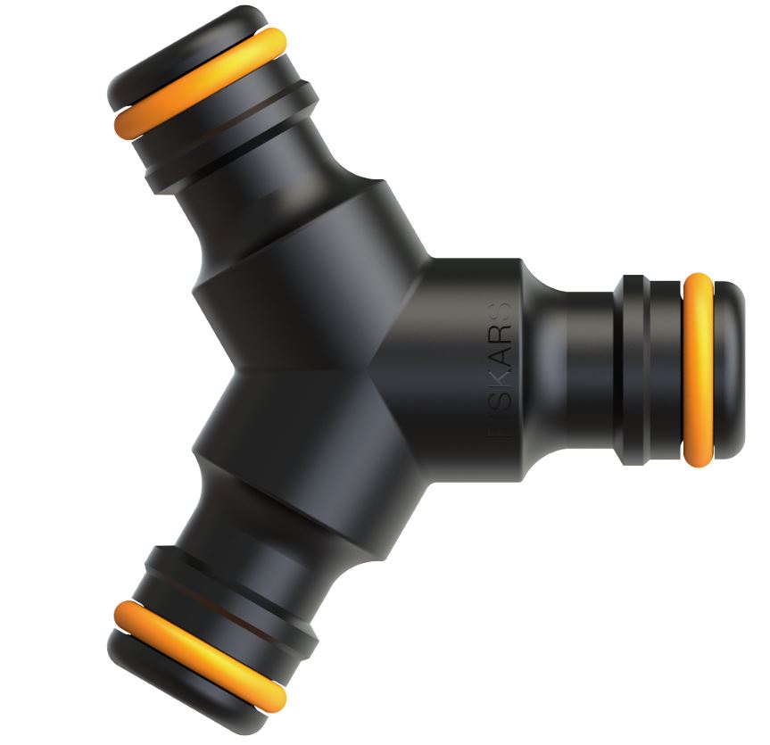 Fiskars 3-veis skjøtestykke som fordeler én vanningskilde til to separate vannslanger.