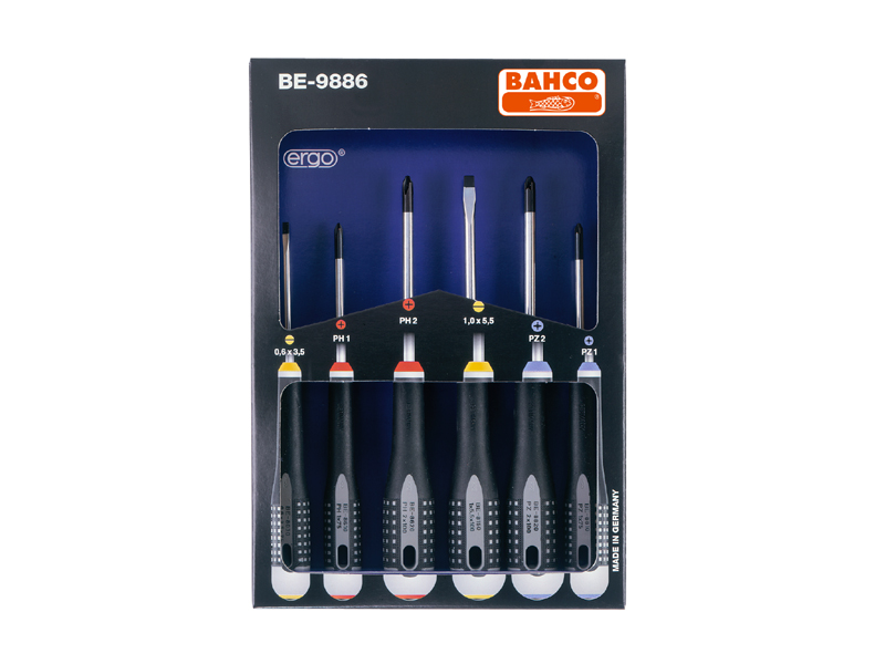 Bahco ERGO skrutrekkersett, BE-9886 med 6 stk. skrutrekkere med herdet og svartoksidert spiss. Fargekode og symbol i håndtaket gjør det lett å velge den riktige skrutrekkeren til oppgaven.