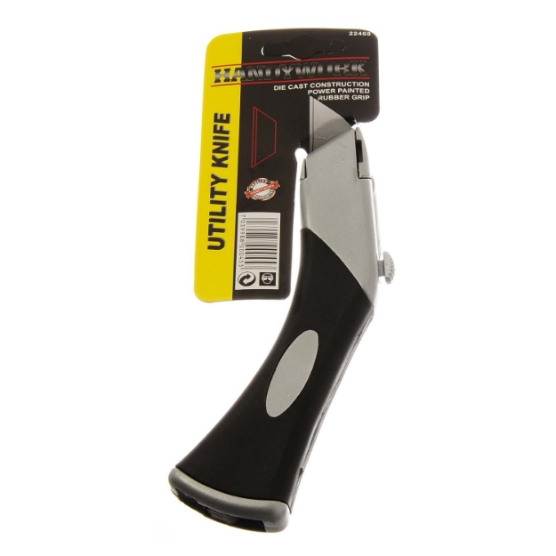 Solid trimmekniv med bøyd gummihåndtak for sikkert grep. Ett blad medfølger. Ekstra blad kan oppbevares inni håndtaket.