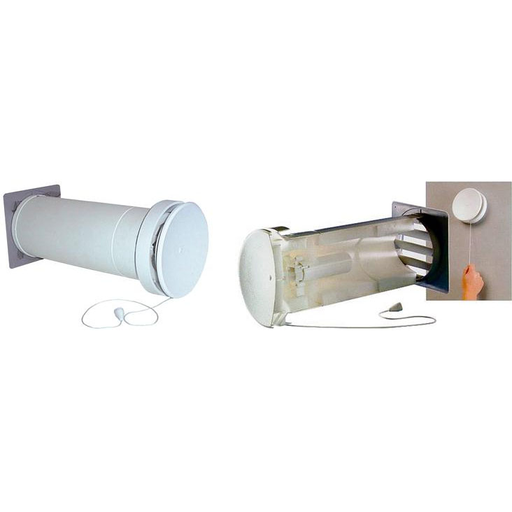 Skeisvoll trekk- og lydreduserende teleskopsventil ⌀4". Komplett med innvendig ventil med snortrekk, utvendig grå rist og 25-40 cm teleskopkanal.